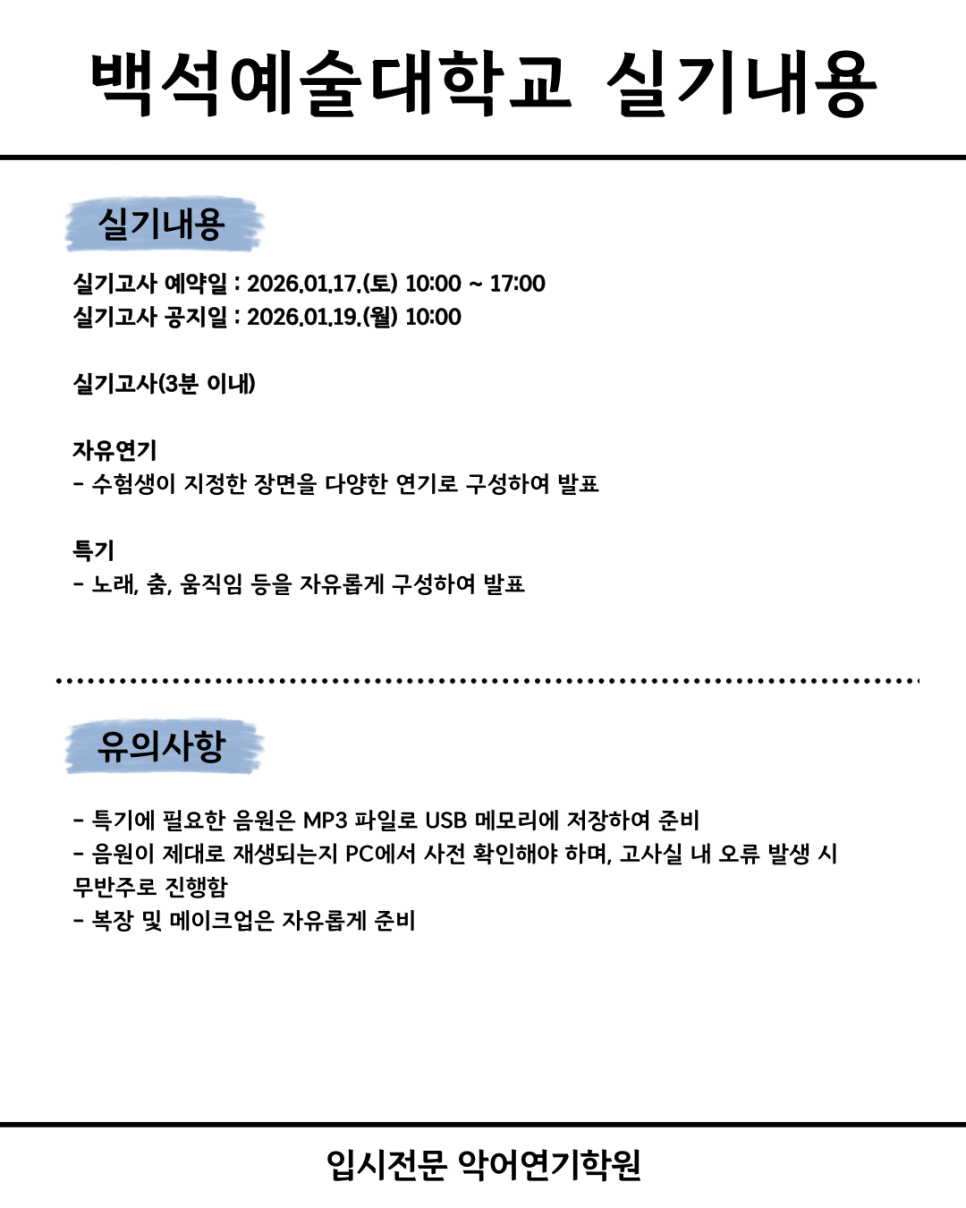 연기레슨 백석예술대학교 공연예술학부 연기과2026학년도 정시 모집요강_악어연기학원